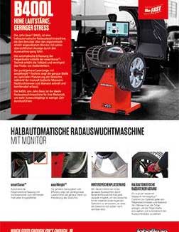 Die B400L ist eine halbautomatische Radauswuchtmaschine, die den Benutzer über den ergonomisch erhöht angeordneten Monitor mit seiner übersichtlichen Anzeige durch den Auswuchtvorgang führt. Die automatische Erfassung der Felgenbreite mithilfe der smartSonar™-Technik erhöht die Taktzeit und verringert das Risiko von Bedienfehlern. Der punktgenaue Laserzeiger mit easyWeight™-Technik zeigt die genaue Stelle zur optimalen Platzierung der Gewichte, während der manuell bediente Messarm Raddurchmesser und Abstand schnell und komfortabel erfasst.