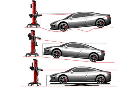 While most systems function by referencing the height of the vehicle from the shop floor, our system measures the height of the targets from the tire contact patch of all four wheels, allowing the vehicle to be calibrated anywhere in the shop; even on an alignment rack.
